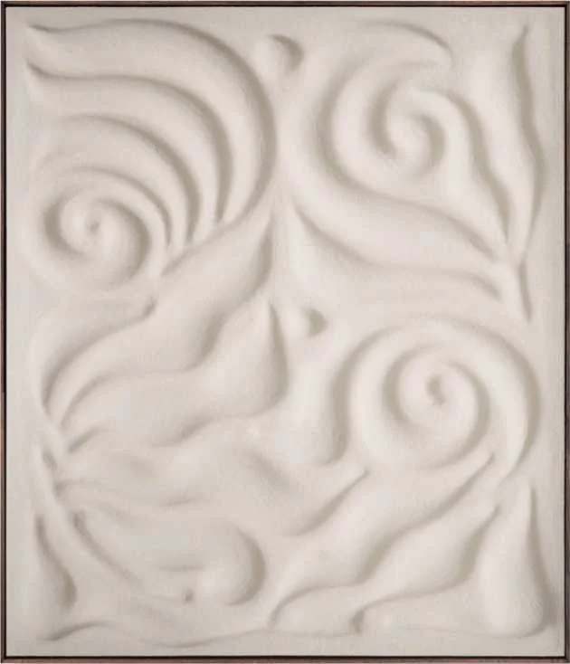 A metamorphosis of form, an evocation of identity. Chirnside’s Sundials unpacks the rich tapestry of our universe in an exploration of space, movement and light. Indents in space this series draws upon the rhythmic fluidity of Sanskrit for inspiration, encapsulating flow and rhythm through abstracted three-dimensional forms. From gestures on paper to the digital, from 3D fabrication to the physical, the work unfolds in earthen tones and plaster. Evoking the windswept face of a sand dune the artworks roll against the light and dance besides time; the face of each work constantly evolving with the sun. Through this interplay the work comes alive morphing from a crescendo of chiaroscuro to softened earthen tones throughout the day. By positioning the sun as the invigilator of his practice Chirnside grounds his viewer, asking them to be receptive to a power beyond themselves.