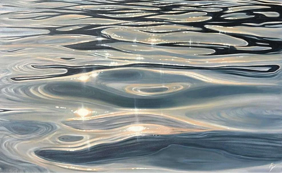 This oil painting captures the fluid, almost hypnotic ripples of sunlight dancing across water. Each brushstroke reflects the tranquility and peace that water surface evokes, intertwined with an element of fleeting luminescence.